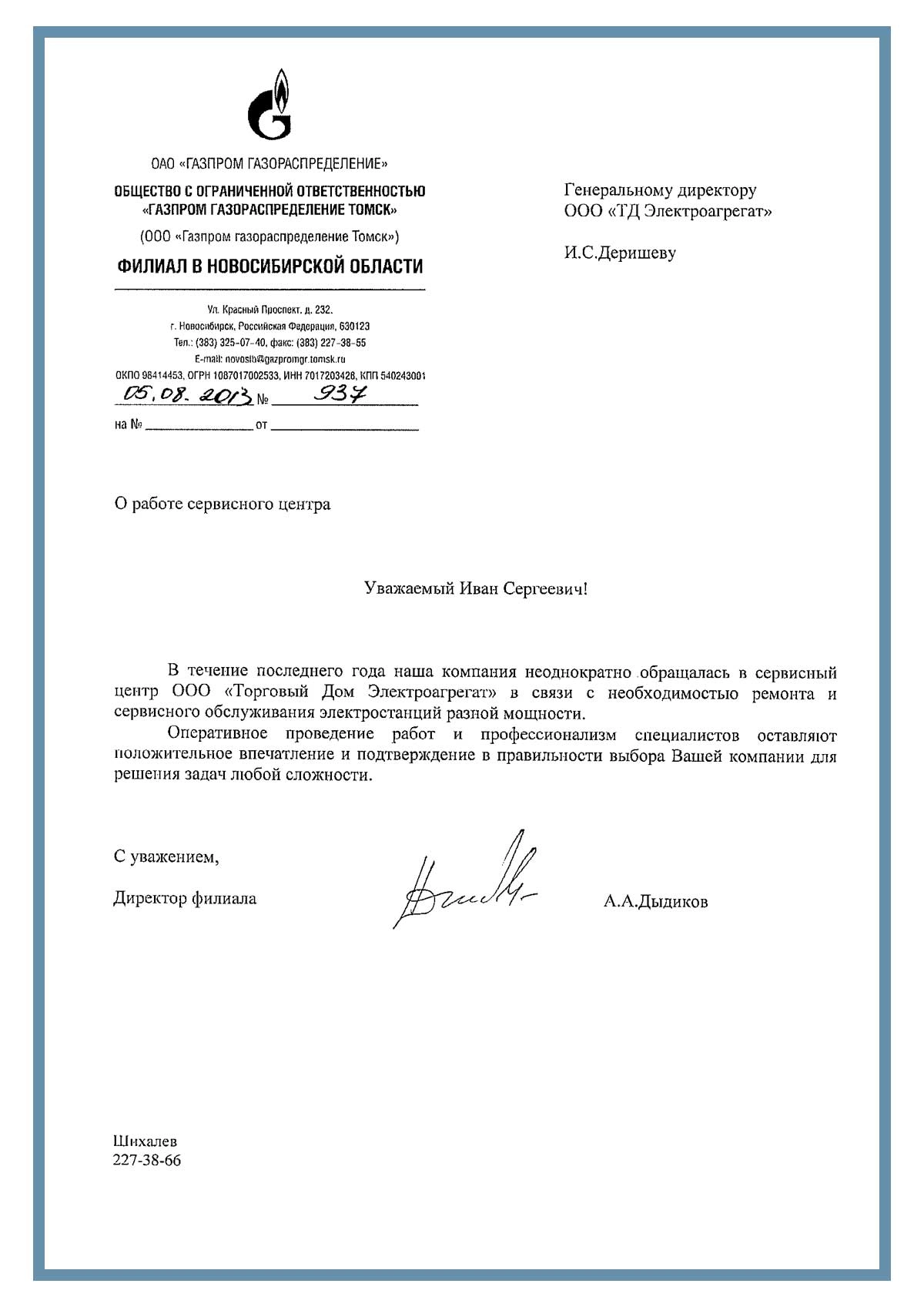Отзыв контрагентов о компании ООО «ТД Электроагрегат» и  исполненном проекте для ООО "Газпром газораспределение Томск" филиал Новосибирская обл.