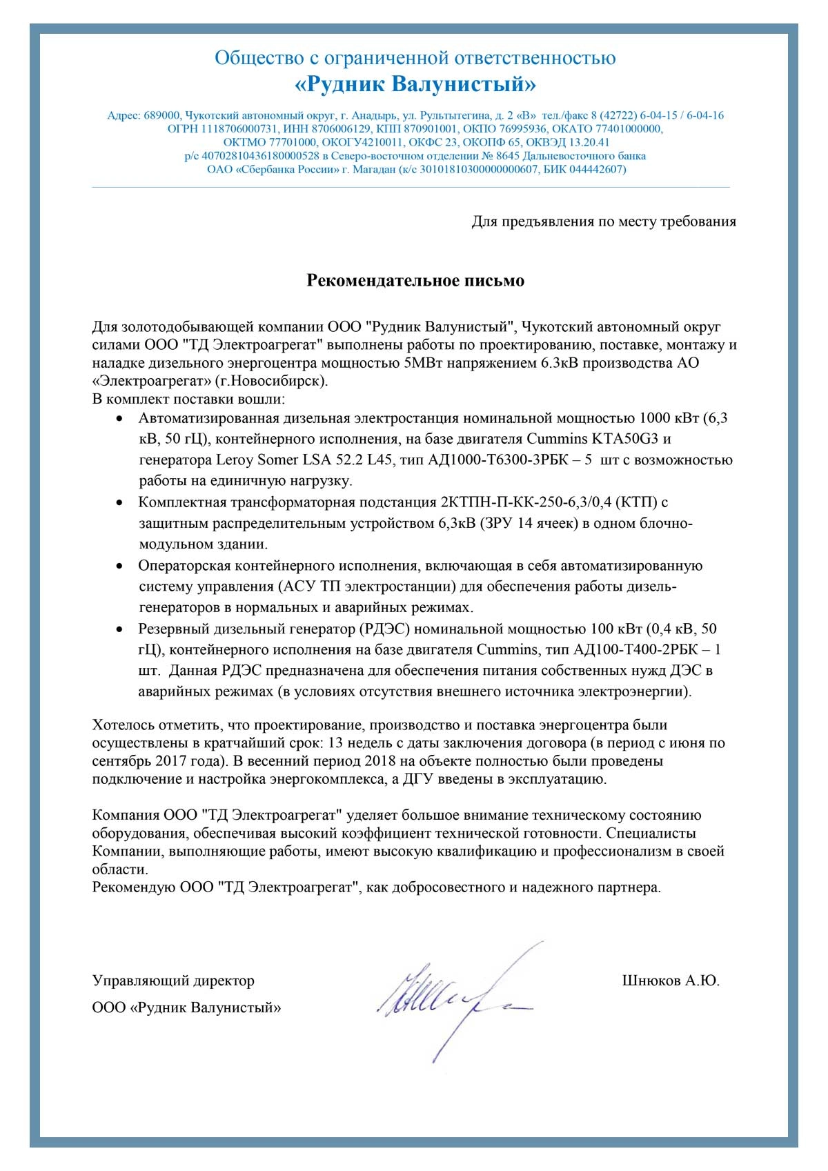 ) ) [reviewBody] => Рекомендательное письмо  Для золотодобывающей компании ООО «Рудник Валунистый», Чукотский автономный округ силами завода «ТД Электроагрегат» выполнены работы по проектированию, поставке, монтажу и наладке дизельного энергоцентра мощностью 5МВт напряжением 6.3кВ производства завода «Электроагрегат» (г.Новосибирск). В комплект поставки вошли: Автоматизированная высоковольтная дизельная электростанция номинальной мощностью 1000 кВт (6,3 кВ, 50 гЦ), контейнерного исполнения, на базе двигателя Cummins KTA50G3 и генератора Leroy Somer LSA 52.2 L45, тип АД1000-Т6300-3РБК - 5 шт с возможностью работы на единичную нагрузку. Комплектная трансформаторная подстанция 2КТПН-П-КК-250-6,3/0,4 (КТП) с защитным распределительным устройством 6,3кВ (ЗРУ 14 ячеек) в одном блочно-модульном здании. Операторская контейнерного исполнения, включающая в себя автоматизированную систему управления (АСУ ТП электростанции) для обеспечения работы дизель- генераторов в нормальных и аварийных режимах. Резервный дизельный генератор (РДЭС) номинальной мощностью 100 кВт (0,4 кВ, 50 гЦ), контейнерного исполнения на базе двигателя Cummins, тип АД100-Т400-2РБК - 1 шт. Данная РДЭС предназначена для обеспечения питания собственных нужд ДЭС в аварийных режимах (в условиях отсутствия внешнего источника электроэнергии). Хотелось отметить, что проектирование, производство и поставка энергоцентра были осуществлены в кратчайший срок: 13 недель с даты заключения договора (в период с июня по сентябрь 2017 года). В весенний период 2018 на объекте полностью были проведены подключение и настройка энергокомплекса, а ДГУ введены в эксплуатацию. Завод «ТД Электроагрегат» уделяет большое внимание техническому состоянию оборудования, обеспечивая высокий коэффициент технической готовности. Специалисты Компании, выполняющие работы, имеют высокую квалификацию и профессионализм в своей области. Рекомендую завод «ТД Электроагрегат», как добросовестного и надежного партнера. Управляющий директор                                                                                                                   Шнюков А.Ю. ) ) )
